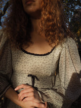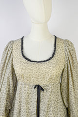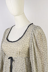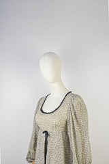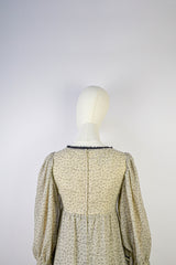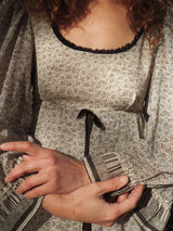 The SYMPHONY Dress from Kati at Laura Phillips drifts straight out of a pastoral dream — a tender ode to the romantic spirit of the 1970s. Crafted from soft cream cotton patterned with delicate florals, she features billowing sleeves, lace-trimmed edges, and ruffled hems that sway like petals in motion. A satin ribbon tie graces the empire waist, gently shaping the silhouette with vintage sweetness.