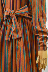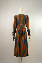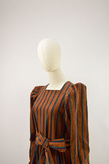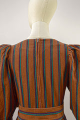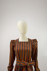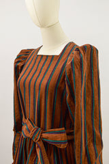 AMBER captures the very essence of a 1980s Laura Ashley prairie dress, a cherished dream come to life. This stunning prairie dream is made from rust corduroy, adorned with a gorgeous stripe pattern in shades of emerald, navy and burgundy. AMBER features billowing puff sleeves, a squared neckline, and a cinched waist that all combine to create an extraordinary silhouette and has her matching belt. She embodies a unique blend of femininity and strength, reminiscent of a superheroine.Out of all the Laura Ashley dresses I've encountered, AMBER holds a special place as a personal favorite, radiating an enchanting and unparalleled charm that is truly remarkable.