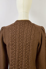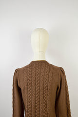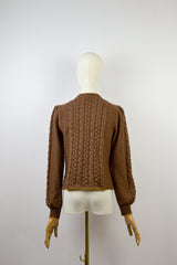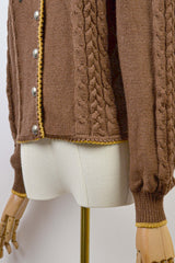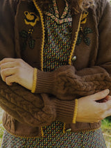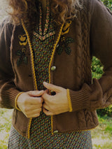 Meet GOLDEN BLOOM — a vintage Lanamoden Austrian wool cardigan that radiates romance and tradition in every stitch. Spun from warm chestnut brown wool, it showcases intricate cable-knit panels along the sleeves and front, framing its most captivating feature: golden floral embroidery in full bloom across the chest. Deep green leaves accent the blossoms, recalling alpine meadows touched by spring sunshine. Silver-toned buttons lend rustic elegance, while fine yellow trim at the neckline, cuffs, and hem adds a gentle finishing touch. At once graceful and cozy, GOLDEN BLOOM is a timeless expression of heritage and poetic, romantic charm.