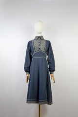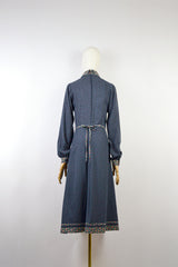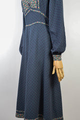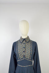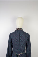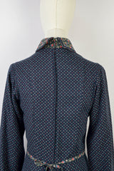 WINTER POSY feels like a sweet, nostalgic breath of winter romance. This 1970s Elkont viscose dress blends tiny heart-like dots with a charming floral bodice, creating a look straight from a snow-dusted storybook. The soft fabric drapes gracefully, while the gently puffed sleeves and floral-trimmed cuffs add a tender, old-world charm. A pointed collar frames the neckline with vintage poise, and a slender tie at the back allows the waist to be cinched just so. Finished with a row of pretty buttons, this dress captures the softness, serenity, and quiet beauty of winter’s blooming moments.