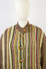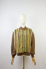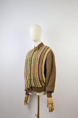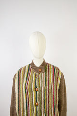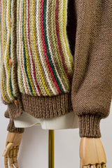 Meet WOODLAND, a vintage 1980s wool cardigan that evokes the charm of an autumn stroll beneath golden trees. Its earthy brown sleeves and ribbed trim radiate warmth, while the front and back panels unfurl in hand-knit stripes of moss green, marigold, cranberry, and cream—each line a tender reflection of nature’s palette. Wooden buttons lend a rustic touch, securing memories of fireside evenings and crisp twilight air. The textured garter stitch deepens its timeless character, striking a balance between comfort and boldness. Slipping into this cardigan is like carrying the romance of another era—handmade artistry, woven stories, and the gentle hush of fall.