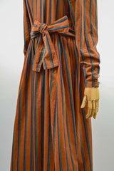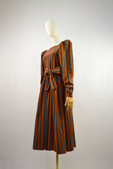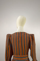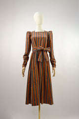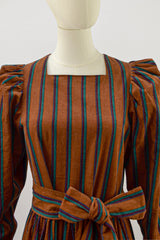 AMBER captures the very essence of a 1980s Laura Ashley prairie dress, a cherished dream come to life. This stunning prairie dream is made from rust corduroy, adorned with a gorgeous stripe pattern in shades of emerald, navy and burgundy. AMBER features billowing puff sleeves, a squared neckline, and a cinched waist that all combine to create an extraordinary silhouette and has her matching belt. She embodies a unique blend of femininity and strength, reminiscent of a superheroine.Out of all the Laura Ashley dresses I've encountered, AMBER holds a special place as a personal favorite, radiating an enchanting and unparalleled charm that is truly remarkable.
