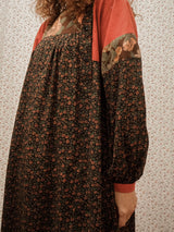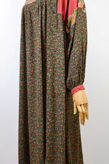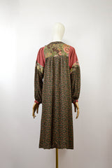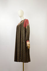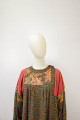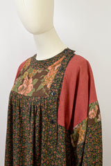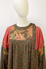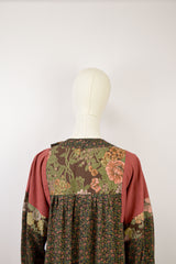 Meet CROSCOMIA, a 1980s Anastasia Paris dress is a dreamy expression of vintage romance, blending charm and comfort in a timeless silhouette. Crafted in a loose, flowing cut, she features a poetic patchwork of floral prints that feel both nostalgic and enchanting. The bodice and shoulders are adorned with painterly blossoms in warm autumnal tones—russet reds, soft corals, and deep forest greens—while the rest of the dress is sprinkled with a meadow of smaller florals, creating a harmonious garden of pattern and texture.