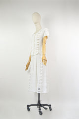 Presenting the ODE TO CROCHET, an exquisite two-piece skirt set from the 1960s that is hand-crocheted to perfection in a pristine white shade. The buttoned top boasts of a charming crochet design pattern, while the A-line skirt is adorned with crochet and fastens with a zip at the center back. The skirt's open weave crochet pattern lends a delicate touch, and it is lined for added comfort. For a complete look, pair it with a 1920s bralette, and experience unmatched comfort and style.